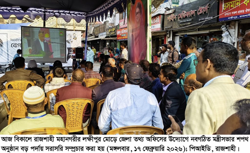 তথ্যবিবরণী সারাদেশের ন্যায় রাজশাহীতে আজ (১৭ ফেব্রুয়ারি) বিকাল চারটায় নবগঠিত মন্ত্রিসভার সদস্যদের শপথ অনুষ্ঠান বড়পর্দায় সরাসরি সম্প্রচার করা হয়েছে। রাজশাহী জেলা তথ্য অফিস নগরীর লক্ষীপুর মোড়ে বড় পর্দায় শপথ অনুষ্ঠান প্রদর্শনের এ উদ্যোগ গ্রহণ করে। উক্ত প্রদর্শনীতে জেলা তথ্য অফিসের পরিচালক তাজকিয়া আকবারীসহ অন্যান্য কর্মকর্তা-কর্মচারী, গণমাধ্যমকর্মী এবং বিভিন্ন শ্রেণী-পেশার বিপুলসংখ্যক মানুষ উপস্থিত ছিলেন।