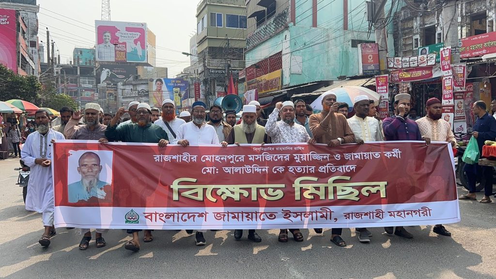 রাজশাহী জেলার মোহনপুর উপজেলায় বাংলাদেশ জামায়াতে ইসলামীর কর্মী ও মসজিদের মুয়াজ্জিন মো. আলাউদ্দিনকে নৃশংস ও বর্বরোচিতভাবে হত্যার প্রতিবাদে বিক্ষাভে সমাবেশ করেছে জামায়াতে ইসলামী রাজশাহী মহানগরী। সোমবার দুপুরে নগরীর সাহেব বাজার এলাকায় বিক্ষাভে শেষে সংক্ষিপ্ত সমাবেশ অনুষ্ঠিত হয়।