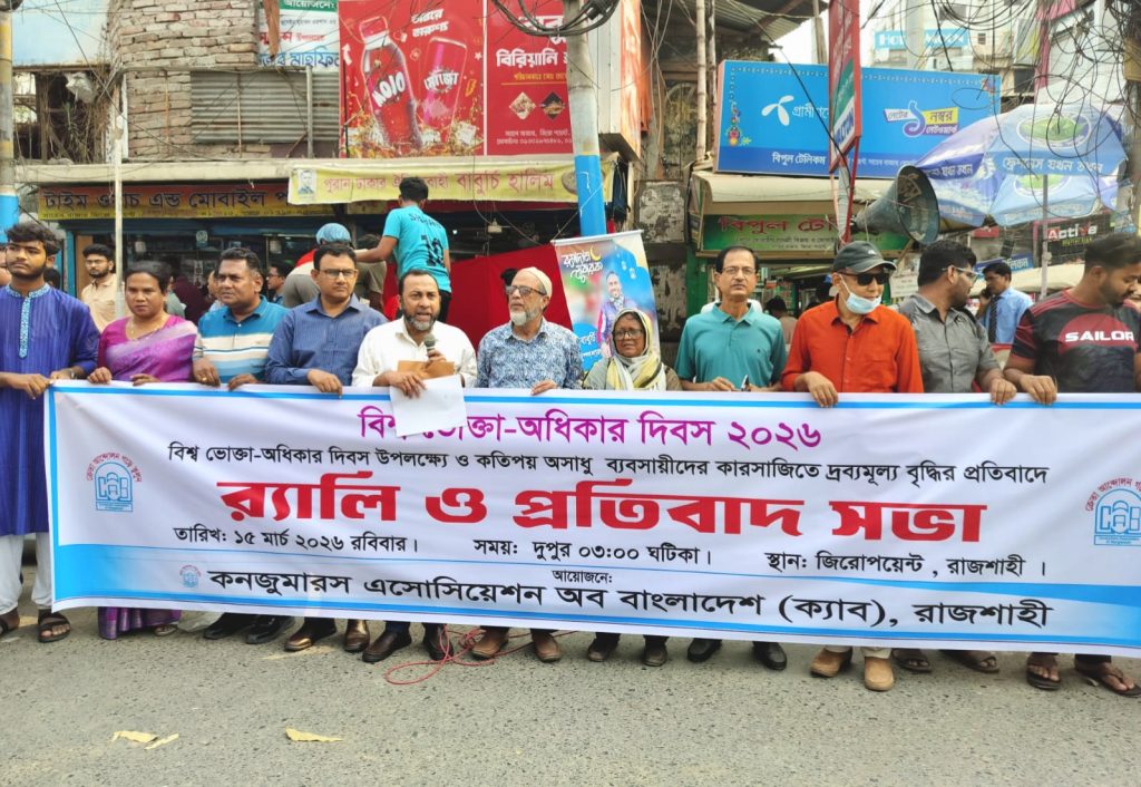 বিশ্ব ভোক্তা-অধিকার দিবস উপলক্ষে বাজারে অসাধু ব্যবসায়ীদের কারসাজিতে নিত্যপ্রয়োজনীয় পণ্যের অযৌক্তিক মূল্যবৃদ্ধির প্রতিবাদে রাজশাহীতে র্যালি ও প্রতিবাদ সভা অনুষ্ঠিত হয়েছে। রোববার (১৫ মার্চ) বিকেলে নগরীর জিরোপয়েন্টে কনজুমারস অ্যাসোসিয়েশন অব বাংলাদেশ (ক্যাব) রাজশাহী শাখার উদ্যোগে এ কর্মসূচি পালিত হয়। সভায় প্রধান অতিথি ছিলেন ক্যাব রাজশাহীর উপদেষ্টা ও দৈনিক সোনালী সংবাদ পত্রিকার সম্পাদক লিয়াকত আলী। সভাপতিত্ব করেন ক্যাব রাজশাহীর সহ-সভাপতি মিজানুর রহমান। মূল প্রবন্ধ উপস্থাপন করেন ক্যাব রাজশাহীর সাধারণ সম্পাদক গোলাম মোস্তফা মামুন।