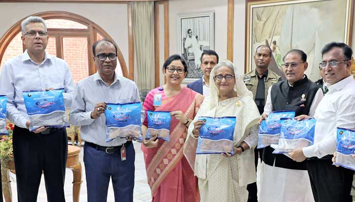 মৎস্য ও প্রাণিসম্পদ মন্ত্রী আব্দুর রহমান ‘বিএফডিসি রেডি-টু-কুক ফিশ’ সামগ্রী প্রধানমন্ত্রী শেখ হাসিনার কাছে হস্তান্তর করেছেন।